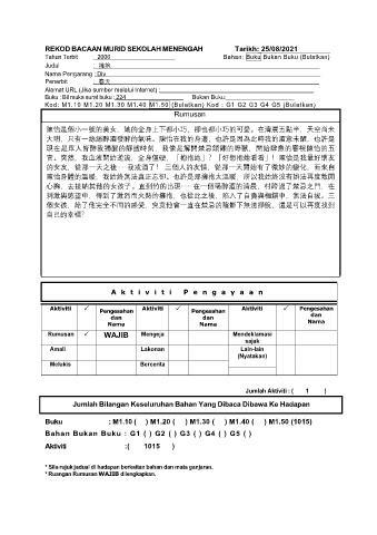 REKOD BACAAN MURID SEKOLAH MENENGAH Tarikh: 25/08/2021