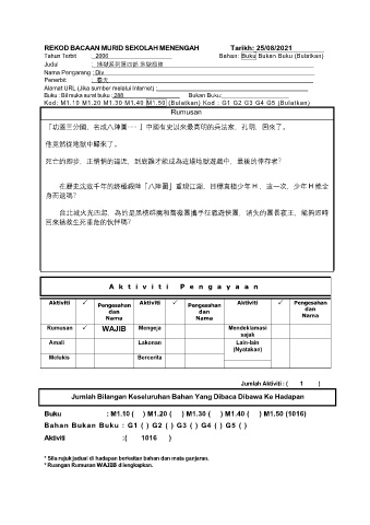 REKOD BACAAN MURID SEKOLAH MENENGAH Tarikh: 25/08/2021