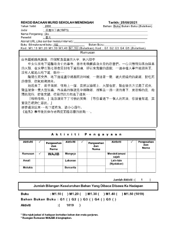REKOD BACAAN MURID SEKOLAH MENENGAH Tarikh: 25/08/2021