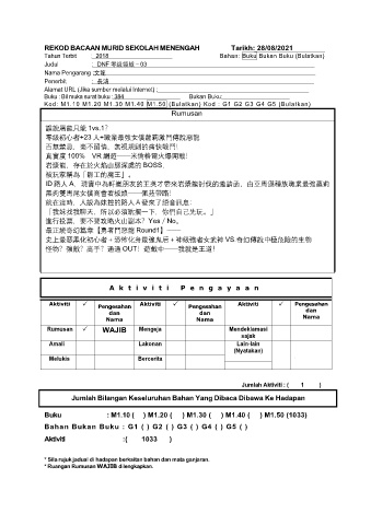 REKOD BACAAN MURID SEKOLAH MENENGAH Tarikh: 28/08/2021