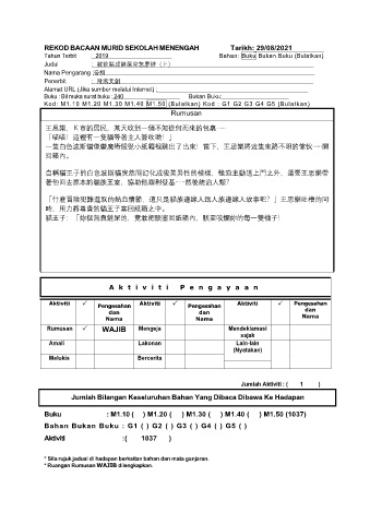 REKOD BACAAN MURID SEKOLAH MENENGAH Tarikh: 29/08/2021