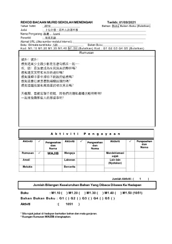 REKOD BACAAN MURID SEKOLAH MENENGAH Tarikh: 01/09/2021