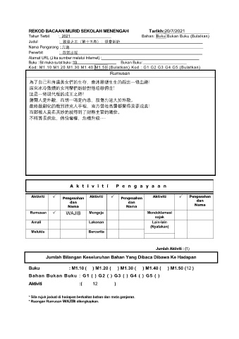 REKOD BACAAN MURID SEKOLAH MENENGAH Tarikh:20/7/2021