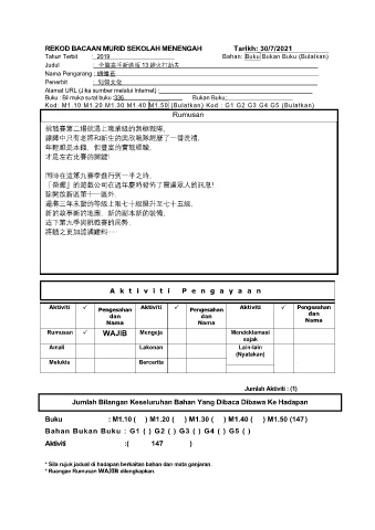 REKOD BACAAN MURID SEKOLAH MENENGAH Tarikh: 30/7/2021