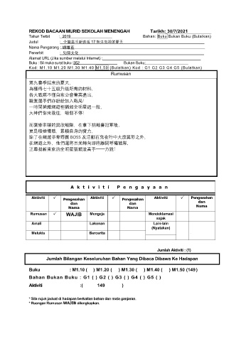 REKOD BACAAN MURID SEKOLAH MENENGAH Tarikh: 30/7/2021