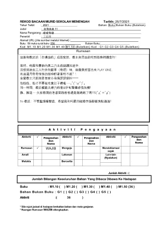 REKOD BACAAN MURID SEKOLAH MENENGAH Tarikh: 25/7/2021