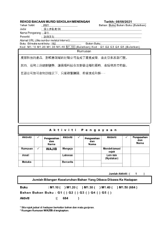 REKOD BACAAN MURID SEKOLAH MENENGAH Tarikh: 08/08/2021