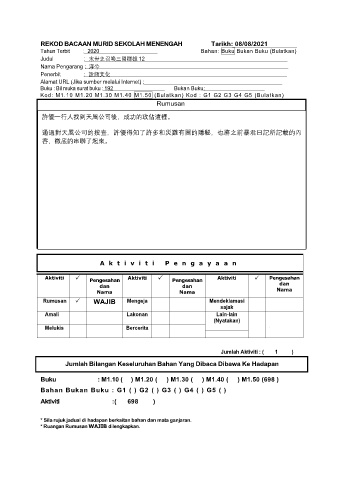 REKOD BACAAN MURID SEKOLAH MENENGAH Tarikh: 08/08/2021