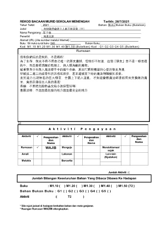 REKOD BACAAN MURID SEKOLAH MENENGAH Tarikh: 28/7/2021