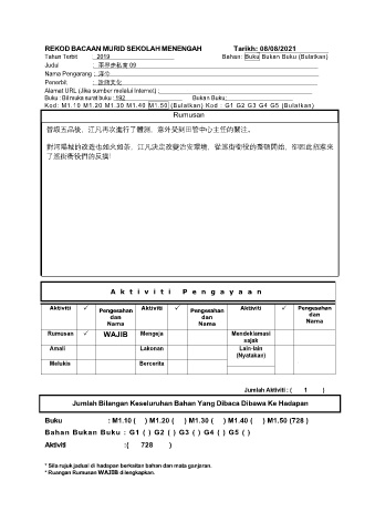 REKOD BACAAN MURID SEKOLAH MENENGAH Tarikh: 08/08/2021