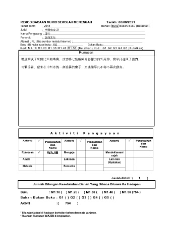 REKOD BACAAN MURID SEKOLAH MENENGAH Tarikh: 08/08/2021