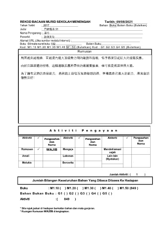 REKOD BACAAN MURID SEKOLAH MENENGAH Tarikh: 09/08/2021