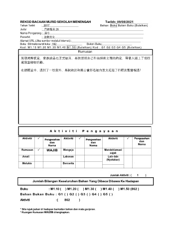 REKOD BACAAN MURID SEKOLAH MENENGAH Tarikh: 09/08/2021