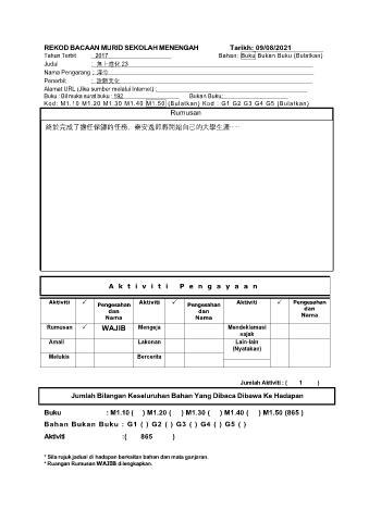 REKOD BACAAN MURID SEKOLAH MENENGAH Tarikh: 09/08/2021