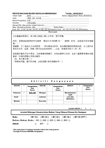 REKOD BACAAN MURID SEKOLAH MENENGAH Tarikh: 14/08/2021