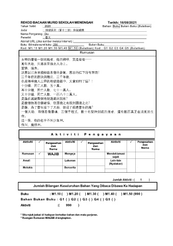 REKOD BACAAN MURID SEKOLAH MENENGAH Tarikh: 16/08/2021