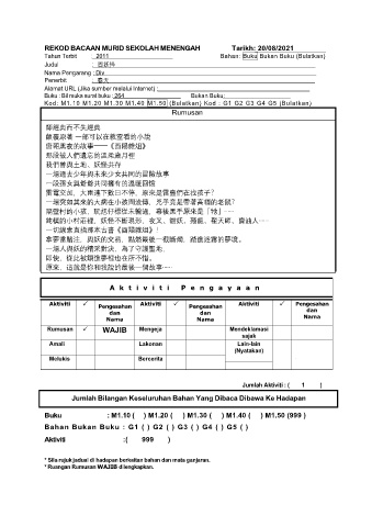 REKOD BACAAN MURID SEKOLAH MENENGAH Tarikh: 20/08/2021