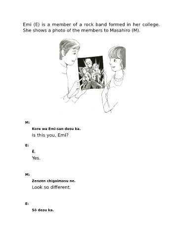 Emi (E) is a member of a rock band formed in her college. She shows a photo of the members to Masahiro (M). M: Kore wa Emi-san desu ka. Is this you, Emi? E: Ē. Yes. M: Zenzen chigaimasu ne. Look so different. E: Sō desu ka.