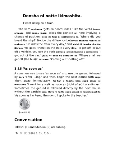 ikimasu ‘He goes (there) on the train every day.’ To get off (or out