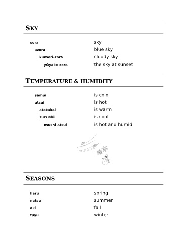 SKY sora sky azora blue sky kumori-zora cloudy sky yūyake-zora the sky at sunset TEMPERATURE & HUMIDITY samui is cold atsui is hot atatakai is warm suzushii is cool mushi-atsui is hot and humid SEASONS haru spring natsu summer aki fall fuyu winter