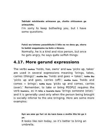 carries (things)’: motte iku ‘holds and goes = takes’; totte iku