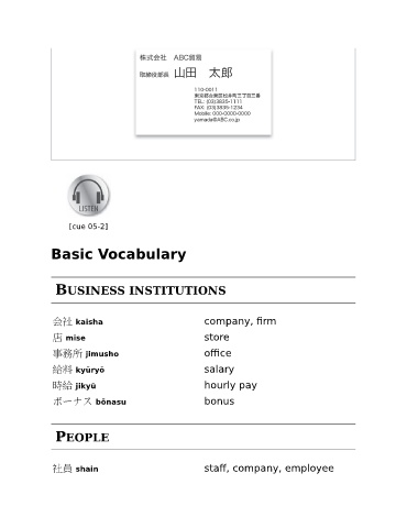 [cue 05-2] Basic Vocabulary BUSINESS INSTITUTIONS 会社 kaisha company, firm 店 mise store 事務所 jimusho office 給料 kyūryō salary 時給 jikyū hourly pay ボーナス bōnasu bonus PEOPLE 社員 shain staff, company, employee