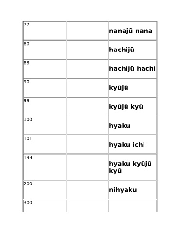 77 nanajū nana 80 hachijū 88 hachijū hachi 90 kyūjū 99 kyūjū kyū 100 hyaku 101 hyaku ichi 199 hyaku kyūjū kyū 200 nihyaku 300