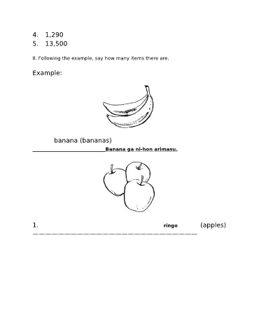 4. 1,290 5. 13,500 II. Following the example, say how many items there are. Example: banana (bananas) Banana ga ni-hon arimasu. 1. ringo (apples) ——————————————————————————