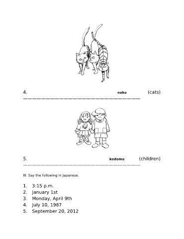 4. neko (cats) —————————————————————————— 5. kodomo (children) —————————————————————————— III. Say the following in Japanese. 1. 3:15 p.m. 2. January 1st 3. Monday, April 9th 4. July 10, 1987 5. September 20, 2012