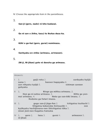 IV 1. goro 2. tasu 3. gurai 4. arimasen 5.