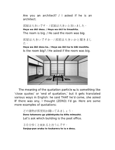 Heya wa ōkii desu ka. / Heya wa ōkii ka to kiki mashita.