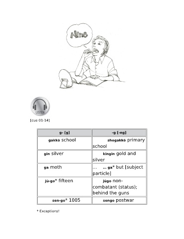 [cue 01-14] g- [g] -g [-ng] gakkō school shogakkō primary school gin silver kingin gold and silver ga moth … … ga* but [subject particle] jū-go* fifteen jūgo non- combatant (status); behind the guns sen-go* 1005 sengo postwar * Exceptions!
