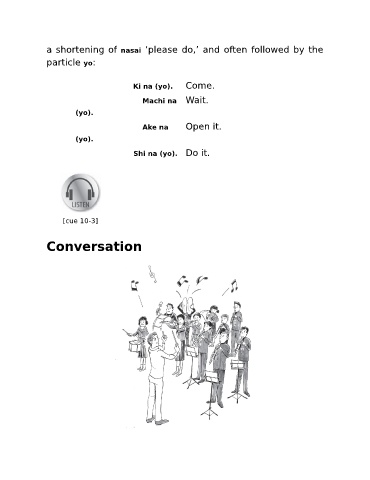 a shortening of nasai ‘please do,’ and often followed by the particle yo: Ki na (yo). Come. Machi na Wait. (yo). Ake na Open it. (yo). Shi na (yo). Do it. [cue 10-3] Conversation