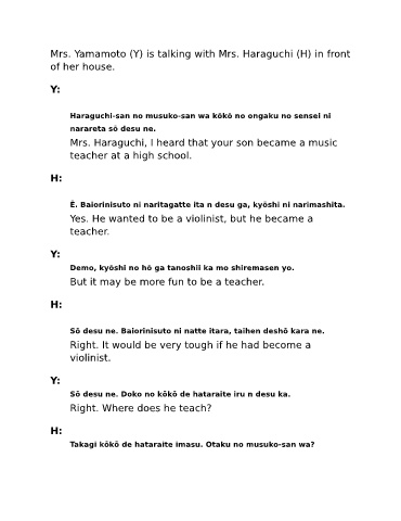 Mrs. Yamamoto (Y) is talking with Mrs. Haraguchi (H) in front