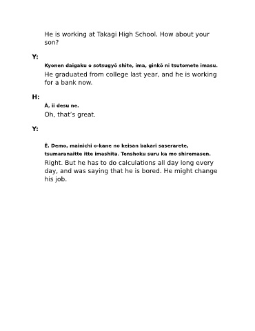 Kyonen daigaku o sotsugyō shite, ima, ginkō ni tsutomete imasu.