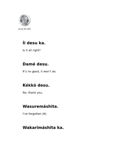 [cue 01-30] Íi desu ka. Is it all right? Damé desu. It’s no good, it won’t do. Kékkō desu. No, thank you. Wasuremáshita. I’ve forgotten (it). Wakarimáshita ka.