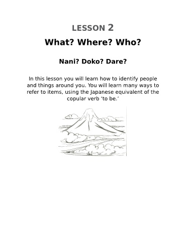 LESSON 2 What? Where? Who? Nani? Doko? Dare? In this lesson you will learn how to identify people and things around you. You will learn many ways to refer to items, using the Japanese equivalent of the copular verb ‘to be.’