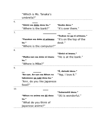 “Ginkō wa doko desu ka.” “Asoko desu.”