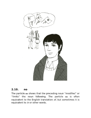2.10. no The particle no shows that the preceding noun “modifies” or “limits” the noun following. The particle no is often equivalent to the English translation of, but sometimes it is equivalent to in or other words.