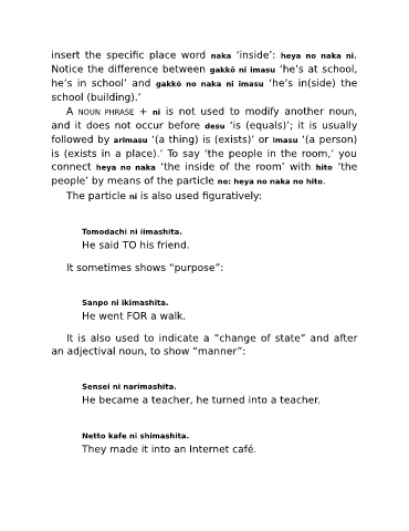 insert the specific place word naka ‘inside’: heya no naka ni.