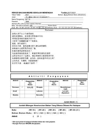REKOD BACAAN MURID SEKOLAH MENENGAH Tarikh:25/7/2021