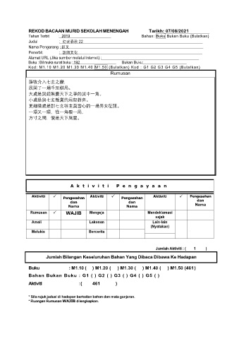 REKOD BACAAN MURID SEKOLAH MENENGAH Tarikh: 07/08/2021