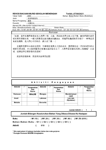 REKOD BACAAN MURID SEKOLAH MENENGAH Tarikh: 07/08/2021