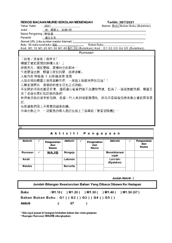 REKOD BACAAN MURID SEKOLAH MENENGAH Tarikh: 28/7/2021