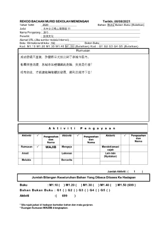 REKOD BACAAN MURID SEKOLAH MENENGAH Tarikh: 08/08/2021