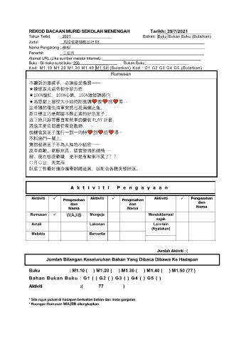 REKOD BACAAN MURID SEKOLAH MENENGAH Tarikh: 29/7/2021