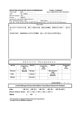 REKOD BACAAN MURID SEKOLAH MENENGAH Tarikh: 11/08/2021