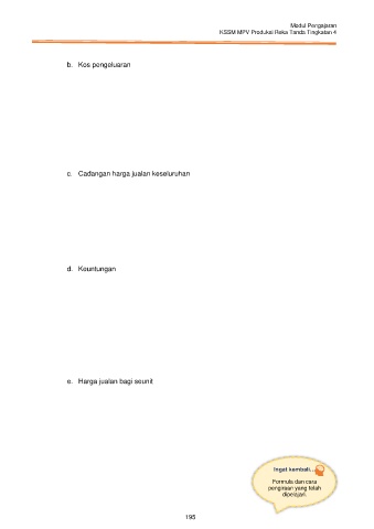 Modul Pengajaran KSSM MPV Produksi Reka Tanda Tingkatan 4 b. Kos pengeluaran c. Cadangan harga jualan keseluruhan d. Keuntungan e. Harga jualan bagi seunit Ingat kembali… Formula dan cara pengiraan yang telah dipelajari. 195