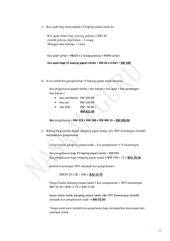 c) Kos upah bagi menyiapkan 15 keping papan tanda itu.