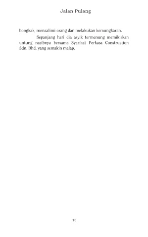 Jalan Pulang bongkak, menzalimi orang dan melakukan kemungkaran. Sepanjang hari dia asyik termenung memikirkan untung nasibnya bersama Syarikat Perkasa Construction Sdn. Bhd. yang semakin malap. 13 Teks Jalan Pulang.indd 13 05/05/2020 14:39:57